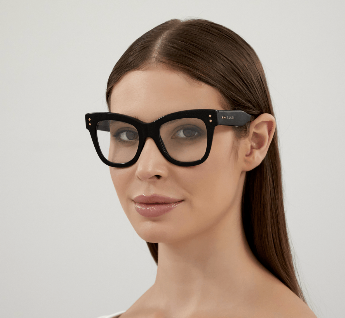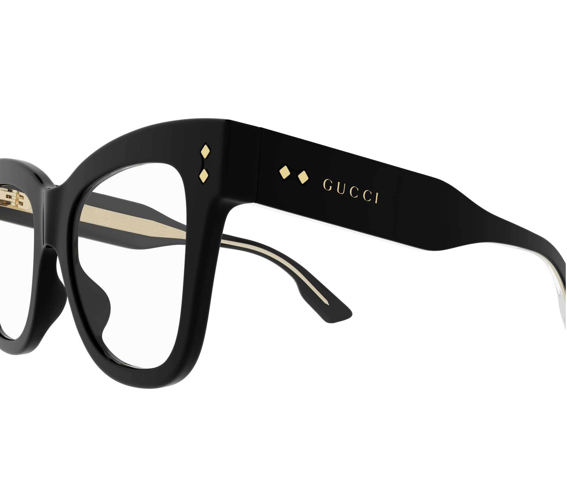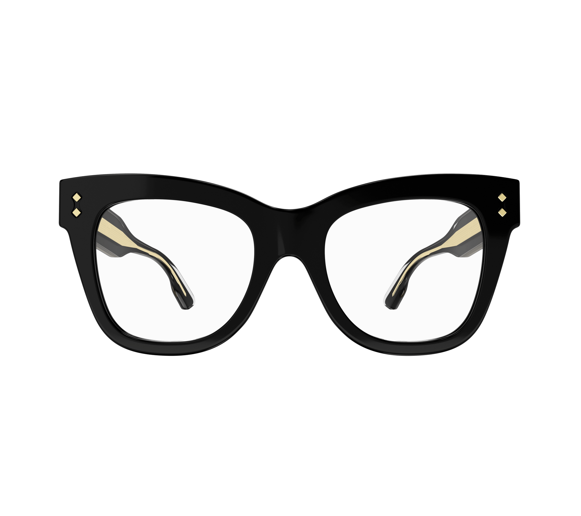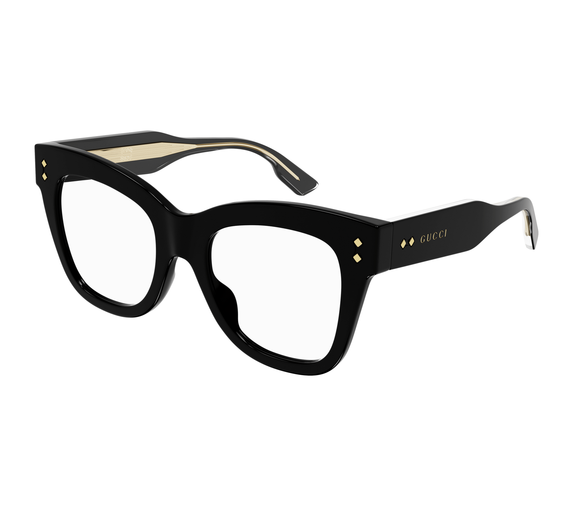 This cat-eye style is characterized by a bold volume and texture, enriched by iconic metal rivets glisten on front and temples. The style is enriched by a distinctive metal wirecore and Gucci lettering logo on both temples
