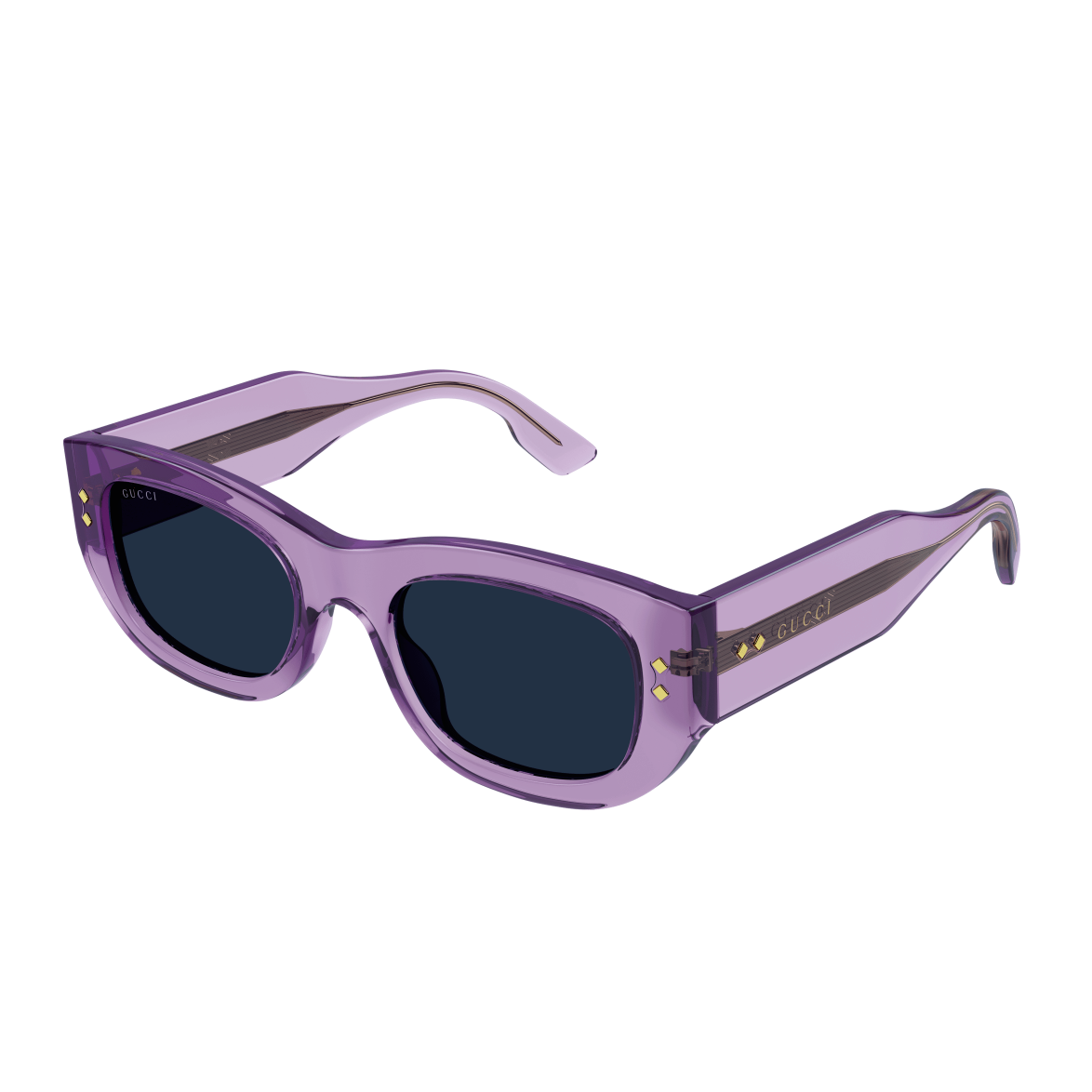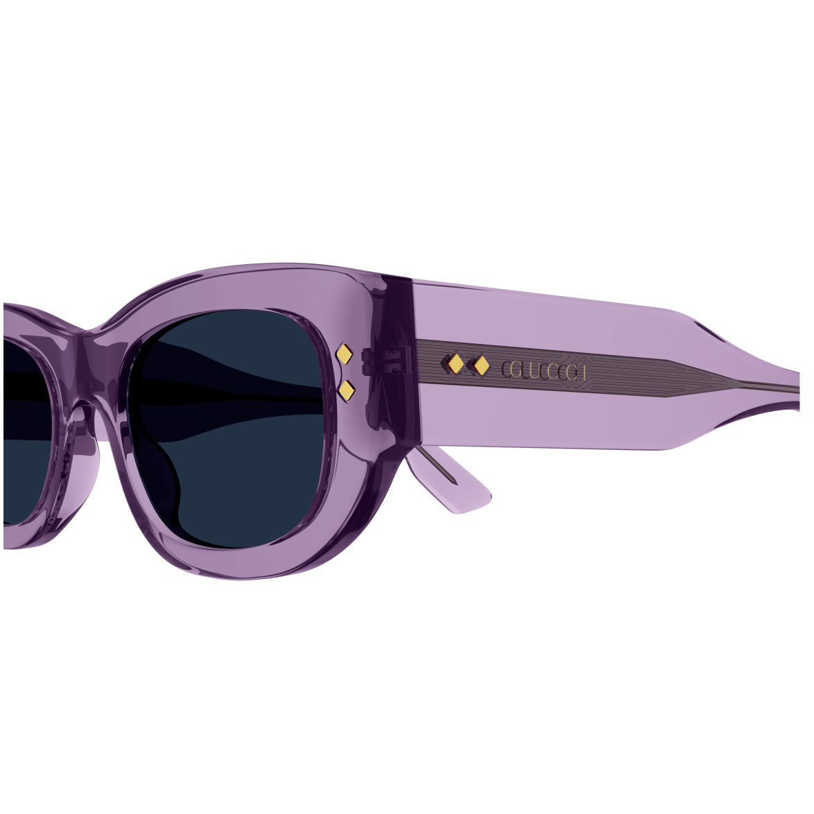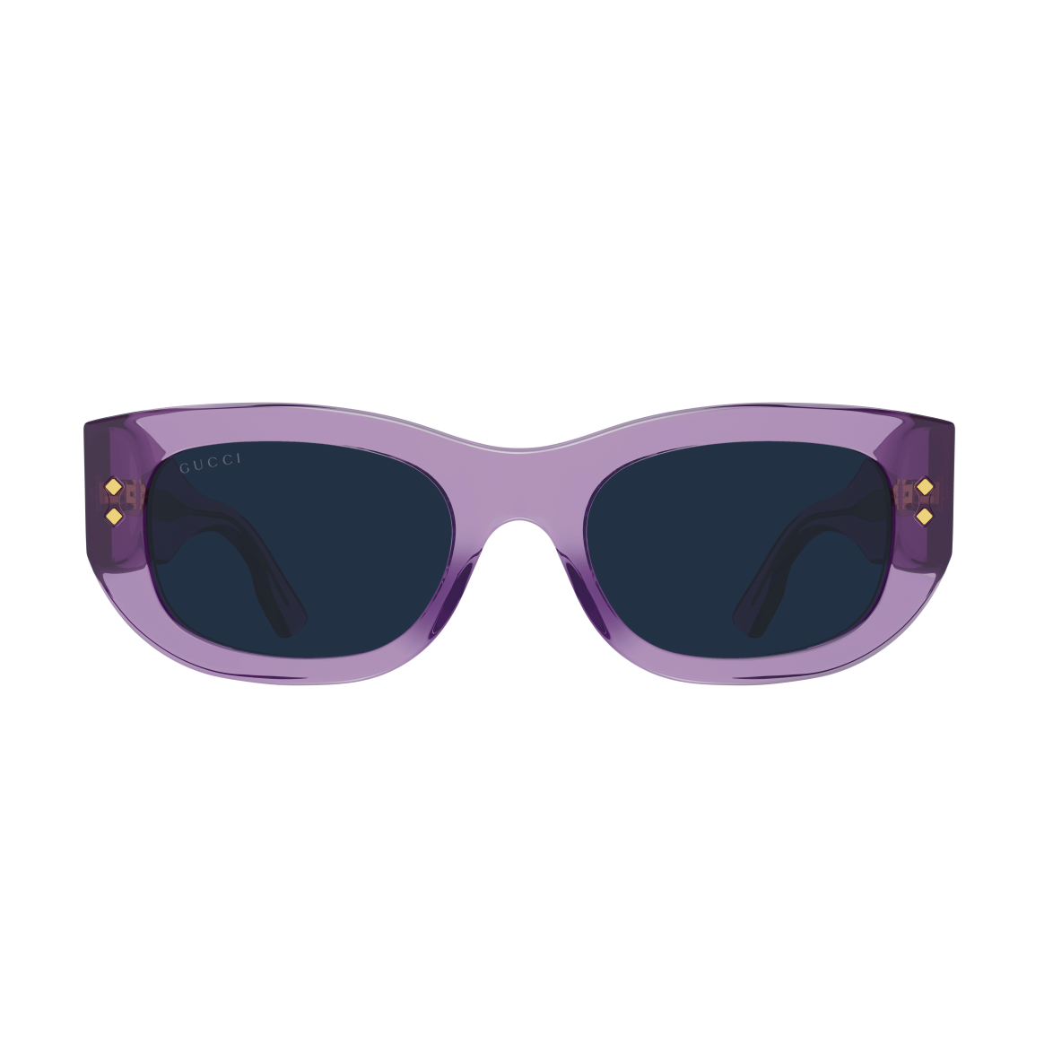 This narrow rectangular style is characterized by a bold volume and texture, enriched by iconic metal rivets glisten on front and temples. The style is enriched by a distinctive metal wirecore and Gucci lettering logo on both temples.