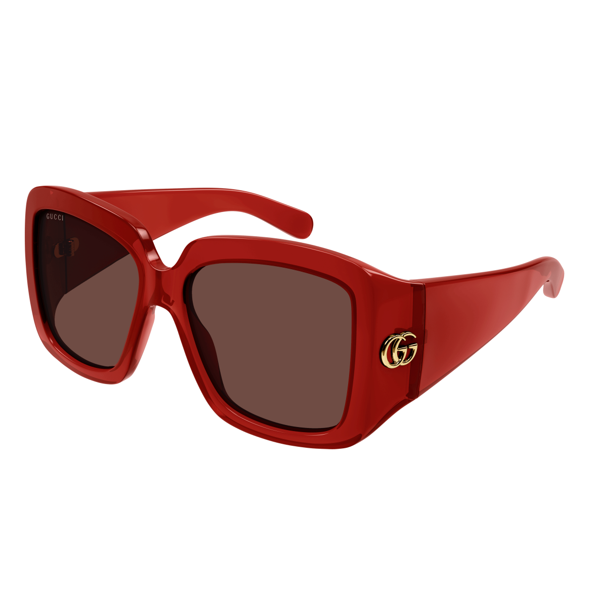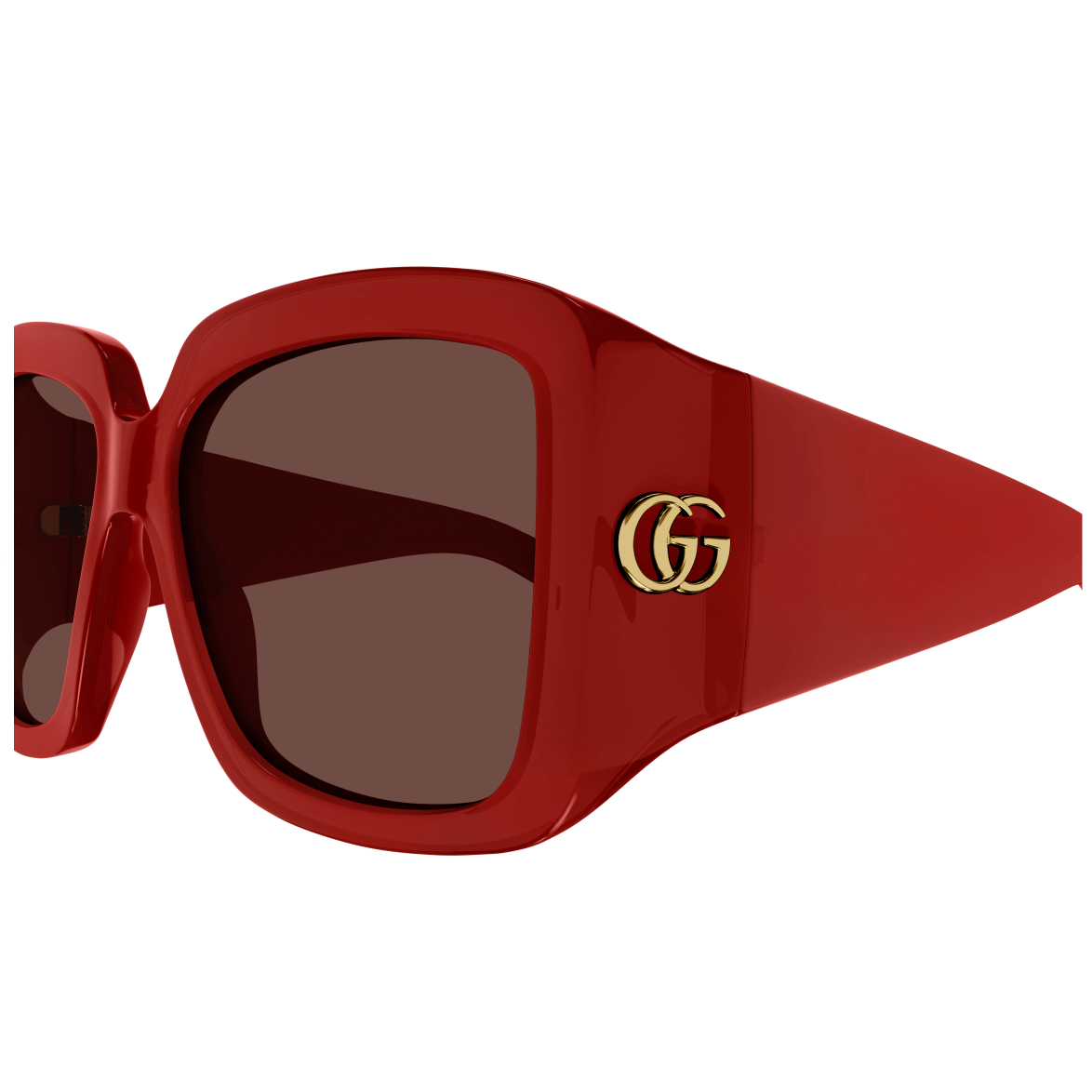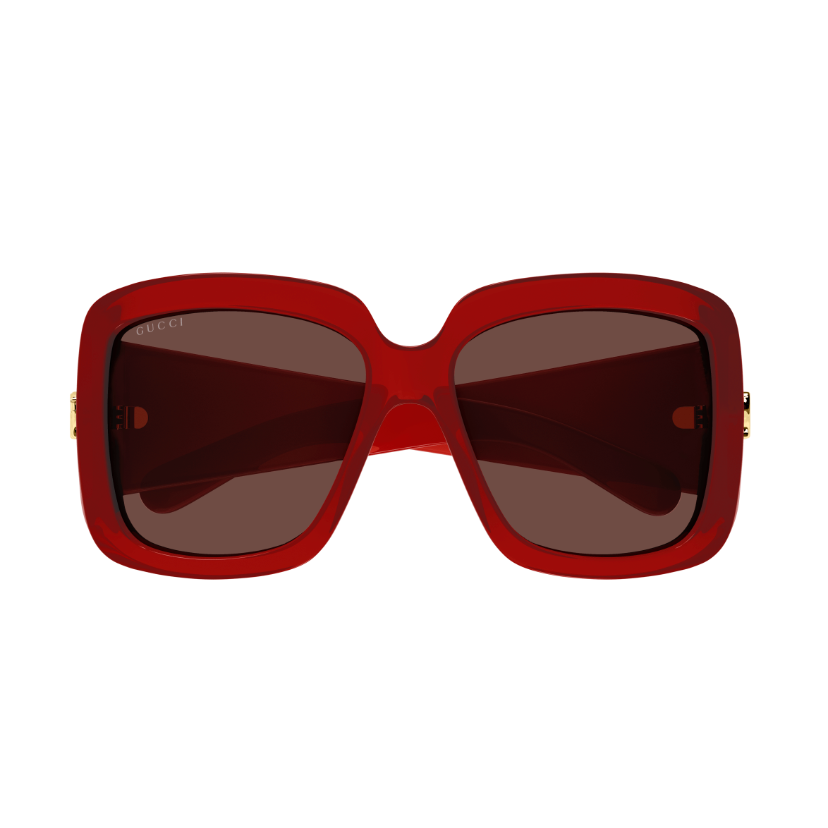 For a modern and feminine look the GG Corner concept is embellished by multifaceted injected construction that makes it unique and timeless. Square oversized shape in bold acetate. Gucci running logo on the side view.