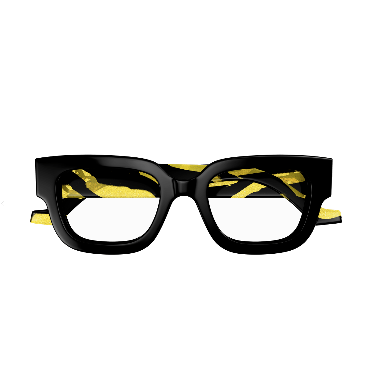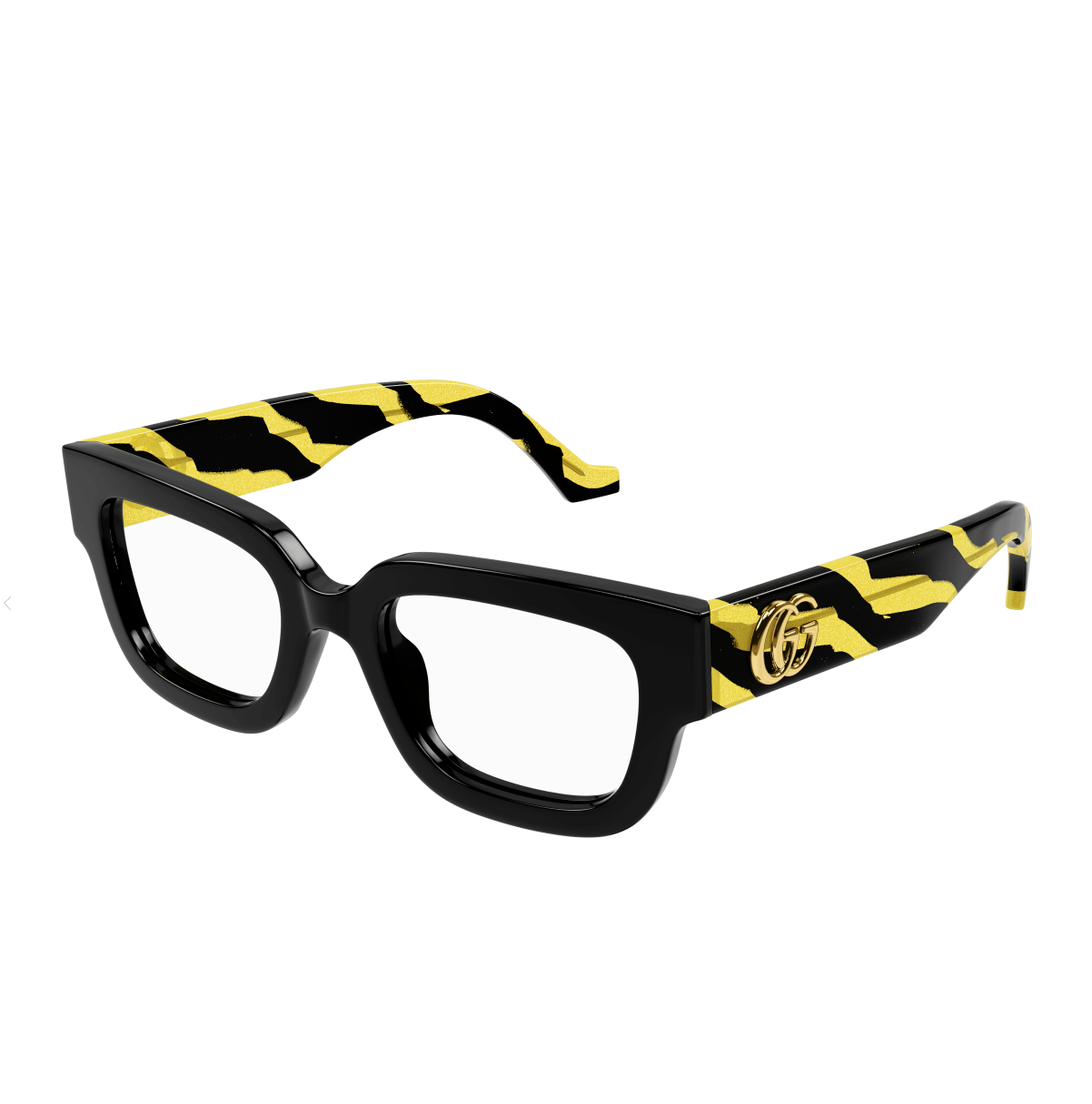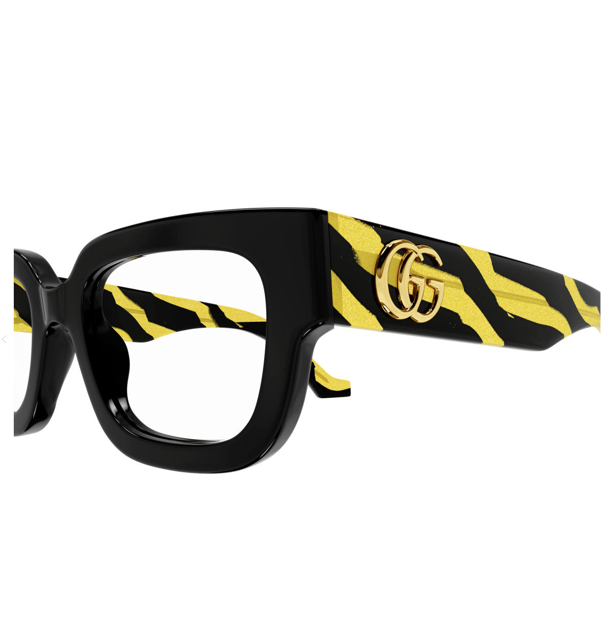 Oversize bold acetate shapes with 45° hinged temples embellished through unique colors for a never-ending diva look. Oversized bold acetate shape. Gold GG interlocking logo in the temple. Commercial yet Fashion color palette with stripes embellished through a glitter effect.
